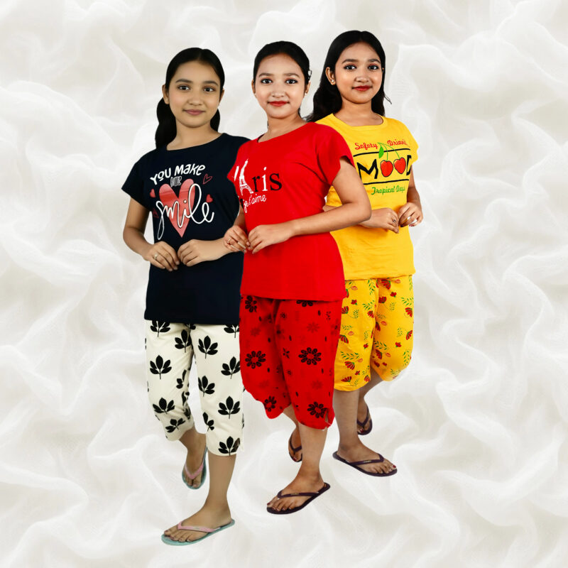 This girls’ cotton printed top and capri pyjama set is thoughtfully designed to provide lasting comfort and everyday practicality.