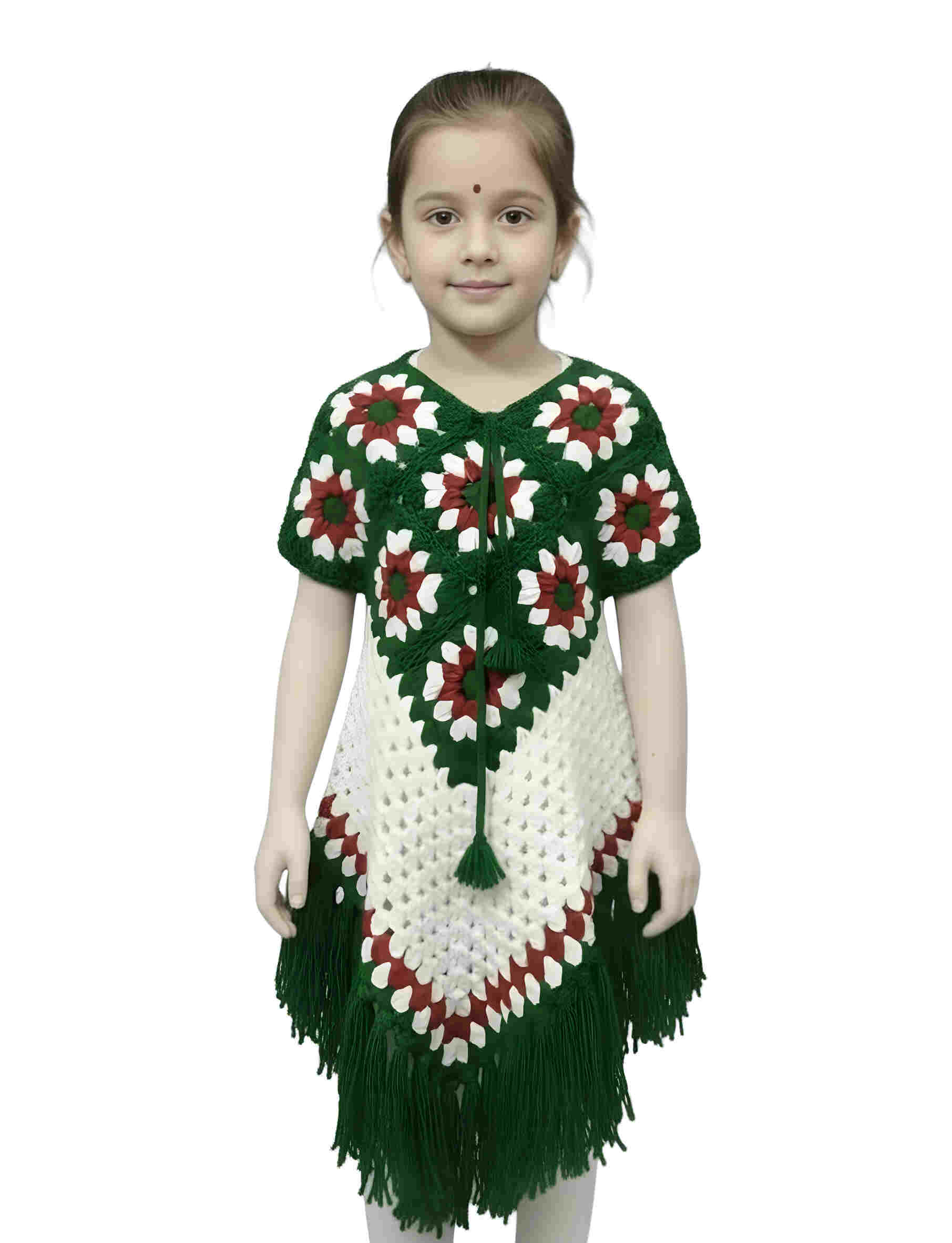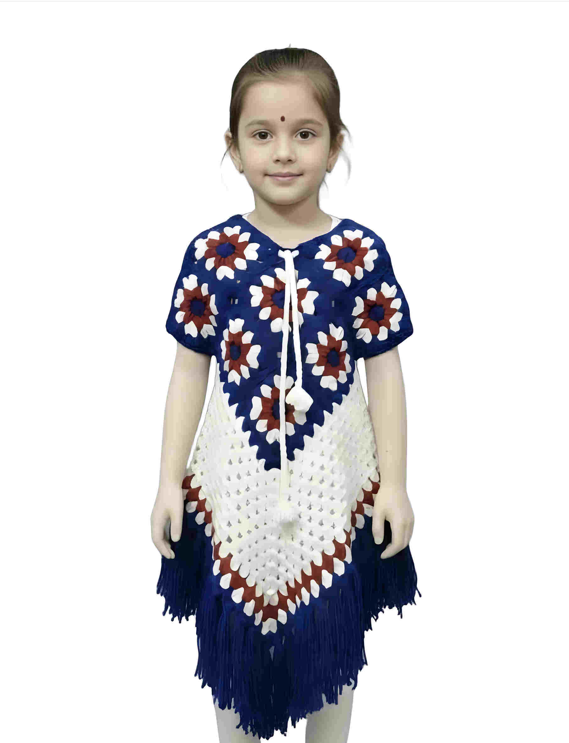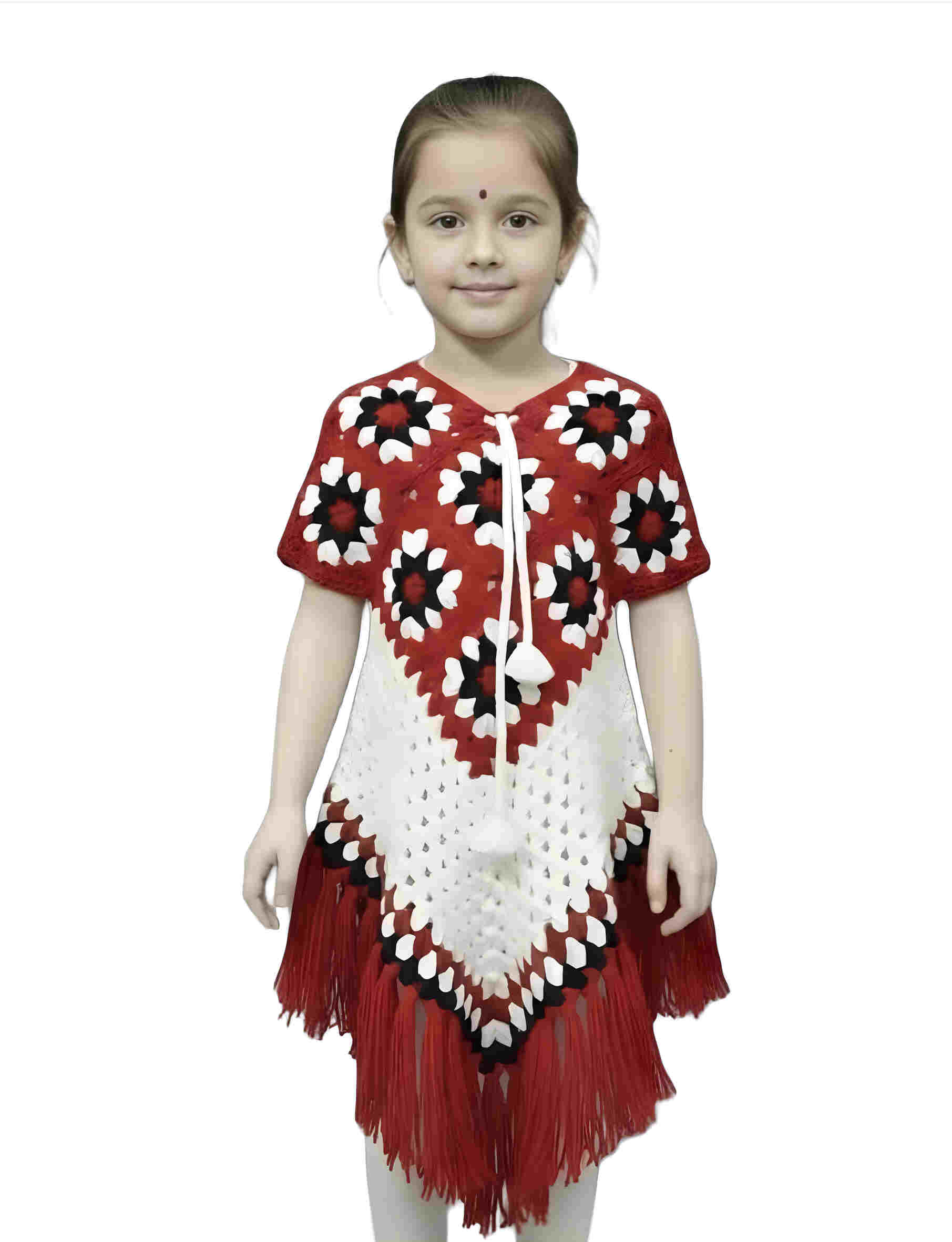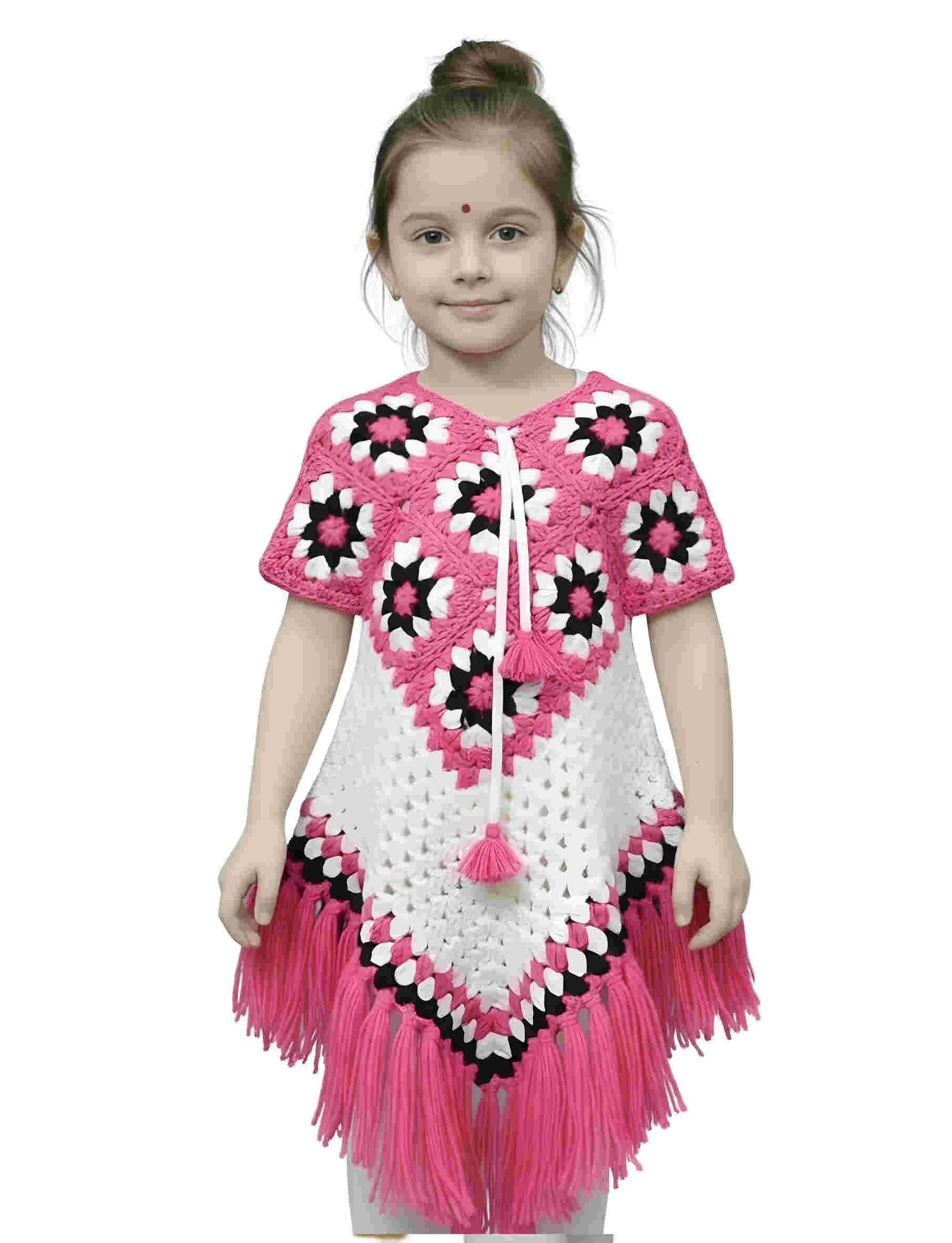 Add a touch of tradition and warmth to your little girl’s wardrobe with this beautifully designed Girls Crochet Poncho Dress. Crafted with a soft, knitted fabric, this poncho-style dress features an elegant floral crochet pattern and a charming tassel fringe hem, giving it a unique and stylish look. The comfortable poncho fit allows easy movement and makes it simple to wear over regular outfits. Lightweight yet cozy, it is perfect for mild winter days, festive occasions, family gatherings, cultural events, or casual outings. The attractive color combination and handcrafted design make this dress stand out while keeping your child comfortable and happy. A perfect blend of comfort, tradition, and style, this crochet poncho dress is an ideal choice for girls who love fashionable and cozy clothing.